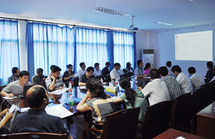 職工代表認真聆聽管理部吳靖斌關于開發(fā)工作的匯報