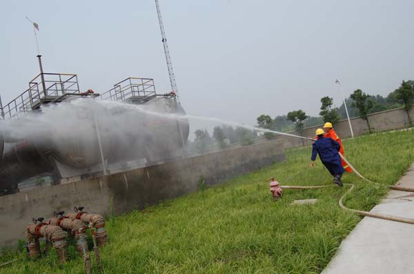 622日上午綠能公司在該公司充氣站,組織實(shí)施《危險(xiǎn)化學(xué)品事故應(yīng)急救援預(yù)案》、《事故應(yīng)急現(xiàn)場(chǎng)處置方案》、《重大危險(xiǎn)員事故應(yīng)急救援預(yù)案》、《重大危險(xiǎn)源事故現(xiàn)場(chǎng)處置方案》的演練。演習(xí)內(nèi)容包括:氣瓶起火撲救、儲(chǔ)罐泄露排除、儲(chǔ)罐火災(zāi)撲救等內(nèi)容。公司副總經(jīng)理唐成煊、相關(guān)部門(mén)人員以及綠能公司全體員工參加了演習(xí)。