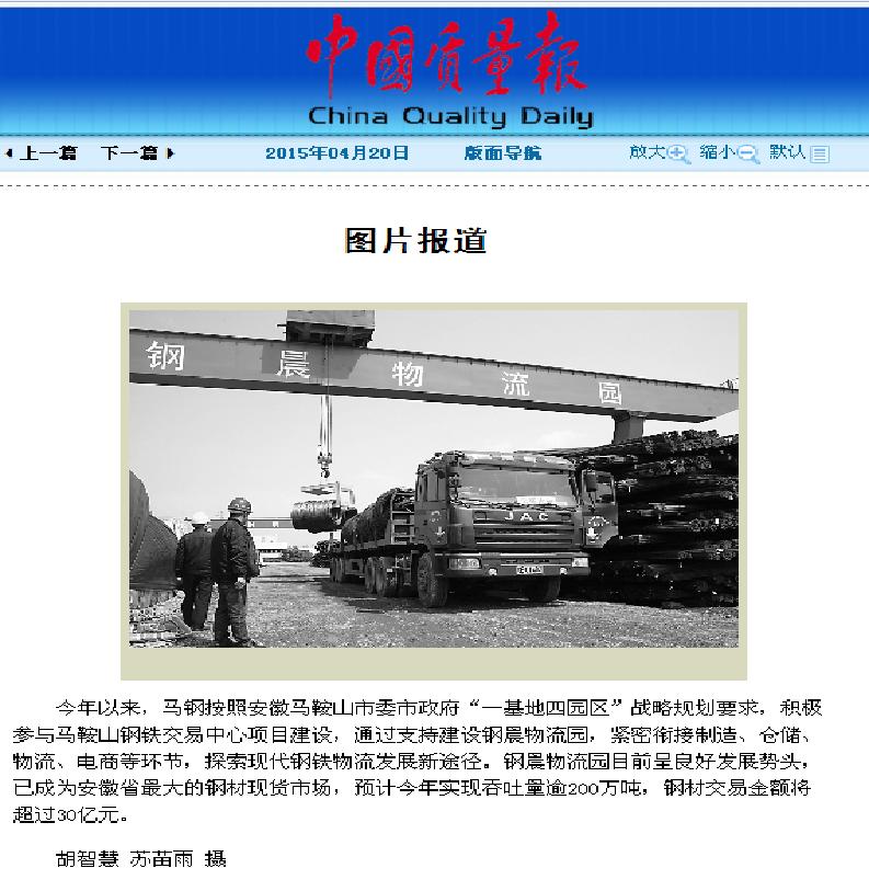 2015年4月20日《中國(guó)質(zhì)量報(bào)》報(bào)道了我公司物流園項(xiàng)目情況。