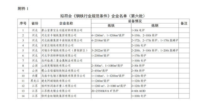 符合《鋼鐵行業(yè)規(guī)范條件》企業(yè)名單(第六批共50家)