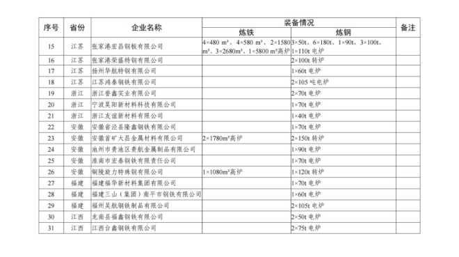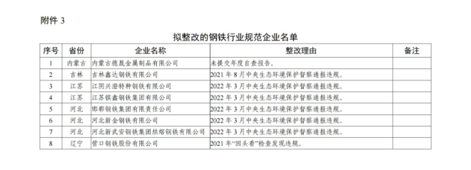 擬整改的鋼鐵行業(yè)規(guī)范企業(yè)名單(共8家)