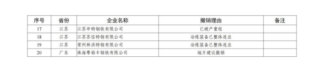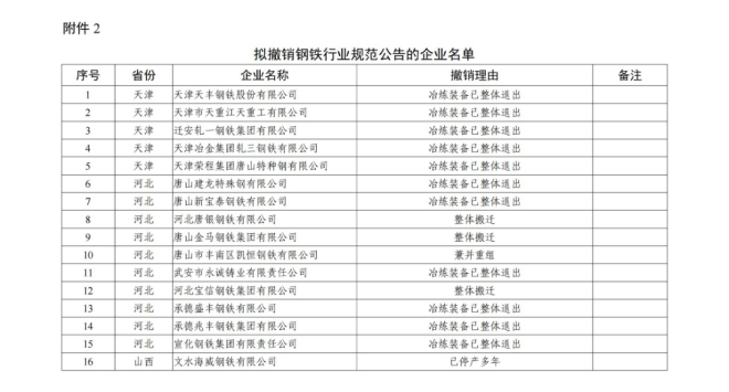 擬撤銷(xiāo)鋼鐵行業(yè)規(guī)范公告的企業(yè)名單(共20家)