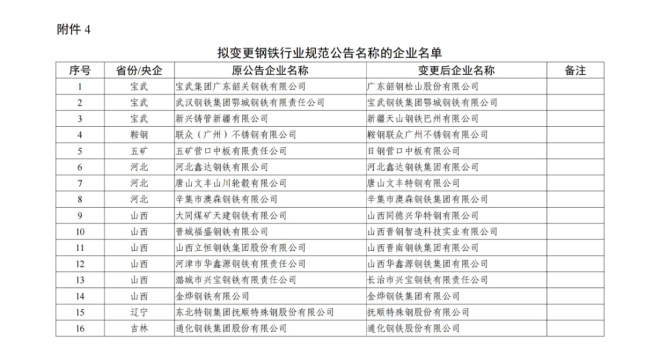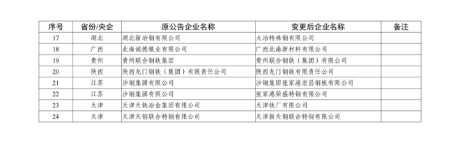 擬變更鋼鐵行業(yè)規(guī)范公告名稱(chēng)的企業(yè)名單(共24家)